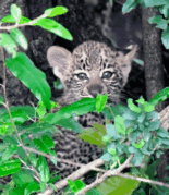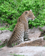 A leopard mother, known to have a very small cub, was discovered resting on a rocky riverbank. The cub was nowhere to be seen but we hoped we might see it later. In fact, two days later we found the mother and her tiny cub deep inside a thicket. It was difficult to see the cub well but we managed to do so with binoculars.