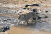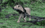 We spent some time with the local lion pride and enjoyed a young male’s hilariously clumsy attempts to cross a river without getting his feet wet. Later, when we caught up with other members of the pride the sub-adults were obviously bored and started to play with a fallen dead tree, tearing off strips of bark. The young male who had amused us earlier crossing the river now managed to wrap a shredded strip of bark several metres long around his head and shoulders. He strutted around proudly with what he seemed to consider was a form of decoration or a badge of honour.