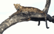 We eventually found the female leopard’s young son, reclining elegantly on the branch of a tree. He had taken his warthog kill up into the tree but now decided to take his prize elsewhere. The tree provided only partial shade so he came down from the tree with the warthog in his mouth and strolled casually past us and on to some bushes where he settled down in good shade.
