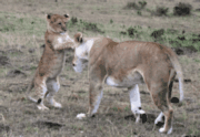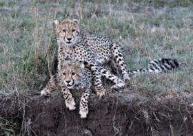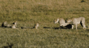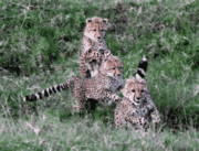 We saw Amani's cubs almost daily and, one morning, witnessed some cheetah behaviour that is rarely seen. In fact, I had observed this only once before on the Serengeti Plains near Ndutu. Two male cheetahs whose range overlapped with Amani's, cornered her and the three cubs. Effectively they held the family prisoners while they checked Amani's suitability for mating. She would not yet be in oestrus - that would happen in a few months, when the three cubs would be separated from their mother - but the two males wanted to make certain.The three youngsters were clearly terrified and Amani placed herself between them and the two males, baring her teeth and spitting fury at her admirers while trying to slash them with her claws. The entire drama was accompanied by an extraordinary cacophony of angry snarling and hissing from all six cheetahs.