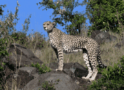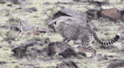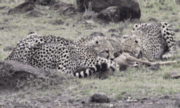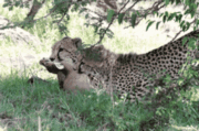 Elephants, however, were less impressed by young cheetahs with ideas above their station. They turned on them and chased them away amid much loud trumpeting. Such activity alerted all the local prey animals to the cheetahs' presence and made it much more difficult for Amani to hunt. Nevertheless, she did manage to make some kills.One involved her in a long run across extremely rocky terrain to catch a young impala, which the family fed on in the shade of a croton bush.