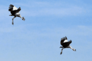 Two Crowned Cranes that had a nest in the nearby salt-lick took exception to the six cheetahs and dropped down from the sky to see what was going on. They strutted around near the feuding cheetahs complaining loudly. Eventually, the male cheetahs lost interest in Amani and moved away to flop down beneath a tree. The family of four took this opportunity to creep away, nervously looking back over their shoulders to check that the males weren’t following them.