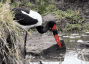 Most game-drives provided excellent bird sightings. Flocks of Eurasian Bee-Eaters were on passage from the north, along with other migrants such as Yellow Wagtail, Northern, Isabelline and Pied Wheatear, Pallid Harrier and Steppe Eagle. Colourful resident species included Purple Grenadier, Violet-backed Starling, Black-headed Oriole and a photographable Schalow’s Turaco, a glamorous but elusive species that is usually difficult to see, let alone photograph. Nearby, two male ostriches were competing for the attentions of five females: the dominant male finally chased his rival away and mated with one of the females.