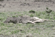Two days later, we found them killing a young topi they had just caught. As they tucked into their kill, a silver-backed jackal repeatedly edged closer and closer. The young male cheetah found this so annoying he chased the jackal away, though it returned almost immediately. The young topi was insufficient for three growing cheetahs so they made an unsuccessful dash for a dik-dik that had wandered too close, leaving the meagre remains of the young topi for the jackal whose persistence was finally rewarded. We also had regular encounters with the two big male cheetahs that Pat and I had seen intimidating Amani and her frightened youngsters back in March.
