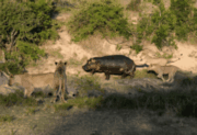 For example, on day 2, we found lions watching a pod of hippos lazing around in a small river. The hippos could see the lions on the riverbank but knew they were safe - as long as they stayed in the water. So, what happened next was very strange: a hippo left the river and ambled around in full view of the lions. Immediately, a sub-adult male lion began to stalk it and was quickly joined by a young lioness. Two more lions were watching with interest. The young male lion leapt on the hippo's back and the lioness grabbed its hindquarters. They lacked the experience of mature lions but the hippo was in real trouble. Somehow it managed to break free from its attackers and ran in panic back to the river where it launched itself from the riverbank and hit the water with a spectacular belly-flop, causing a massive local tsunami.